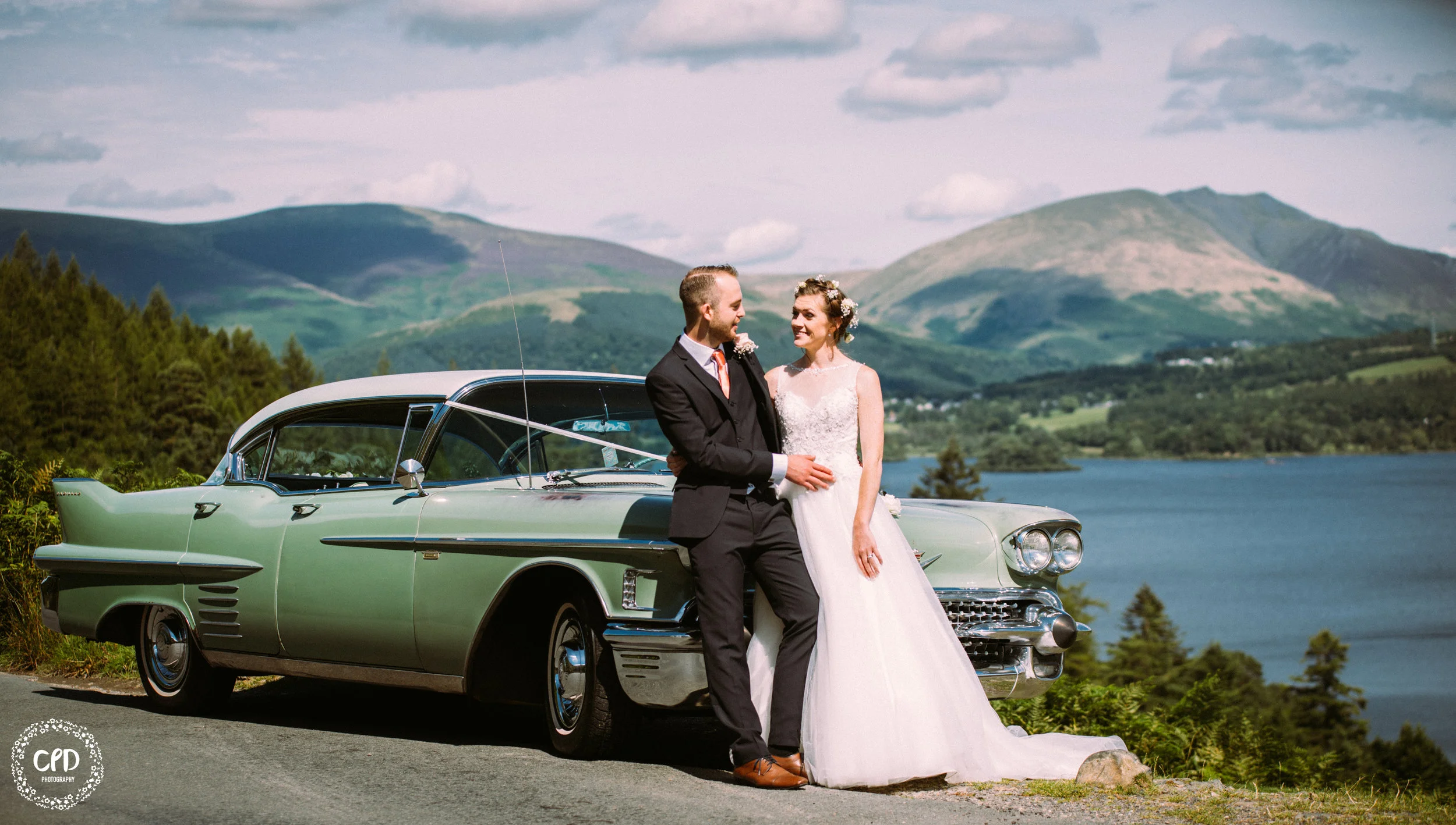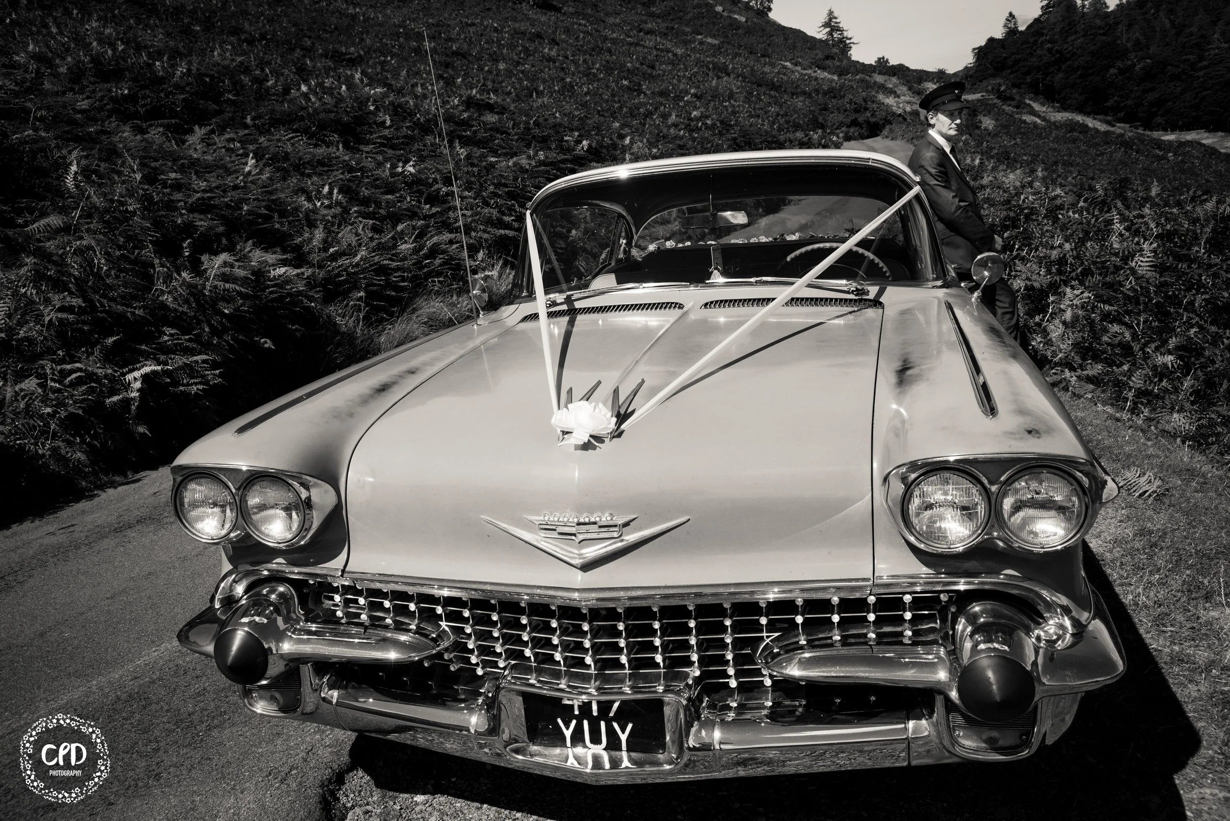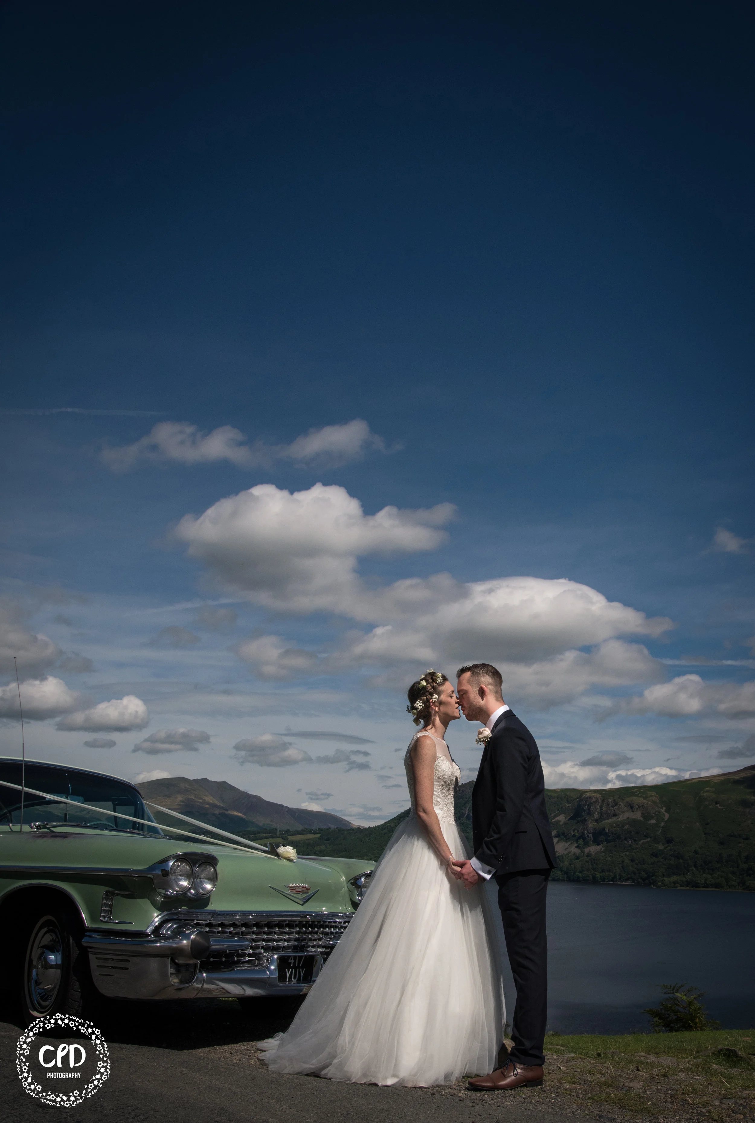 The happy couple live in Keswick - Cumbria and chose the amazing Lodore Falls Hotel just out of town to host their wedding and reception. Cumbria is not best know for having nice weather. However, it remained hot and sunny for the entire day, and enabled them to hold the ceremony outdoors in the gazebo. Excalibur wedding cards provided a beautiful green Cadillac which was a great hit with all of the guests (and me) and brilliant for climbing up the hills around the hotel for some beautiful photo's.